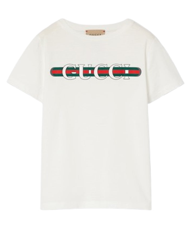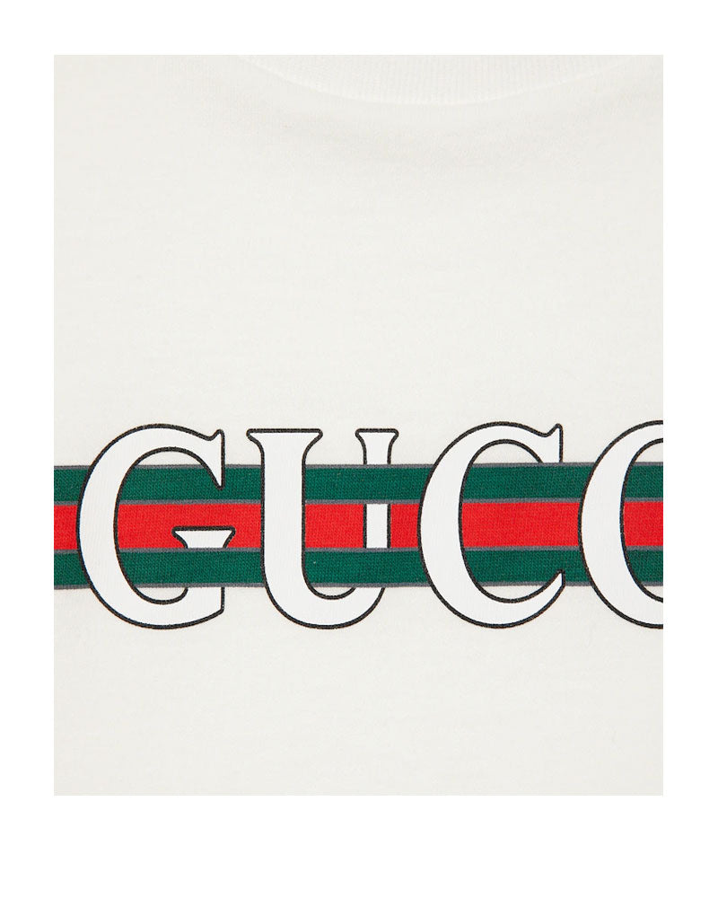 T-shirt in jersey di cotone bianco, stampa Gucci Web, girocollo, maniche corte, finiture a coste, taglio classico.