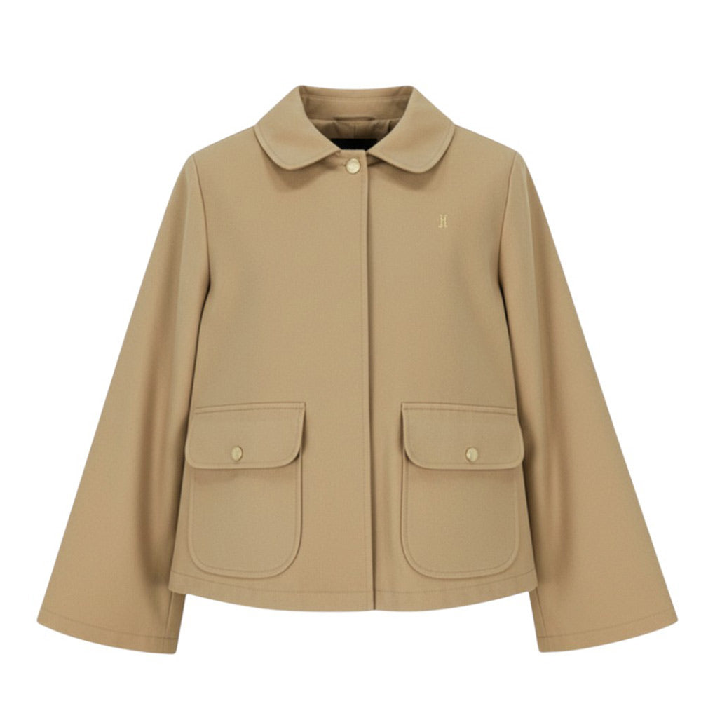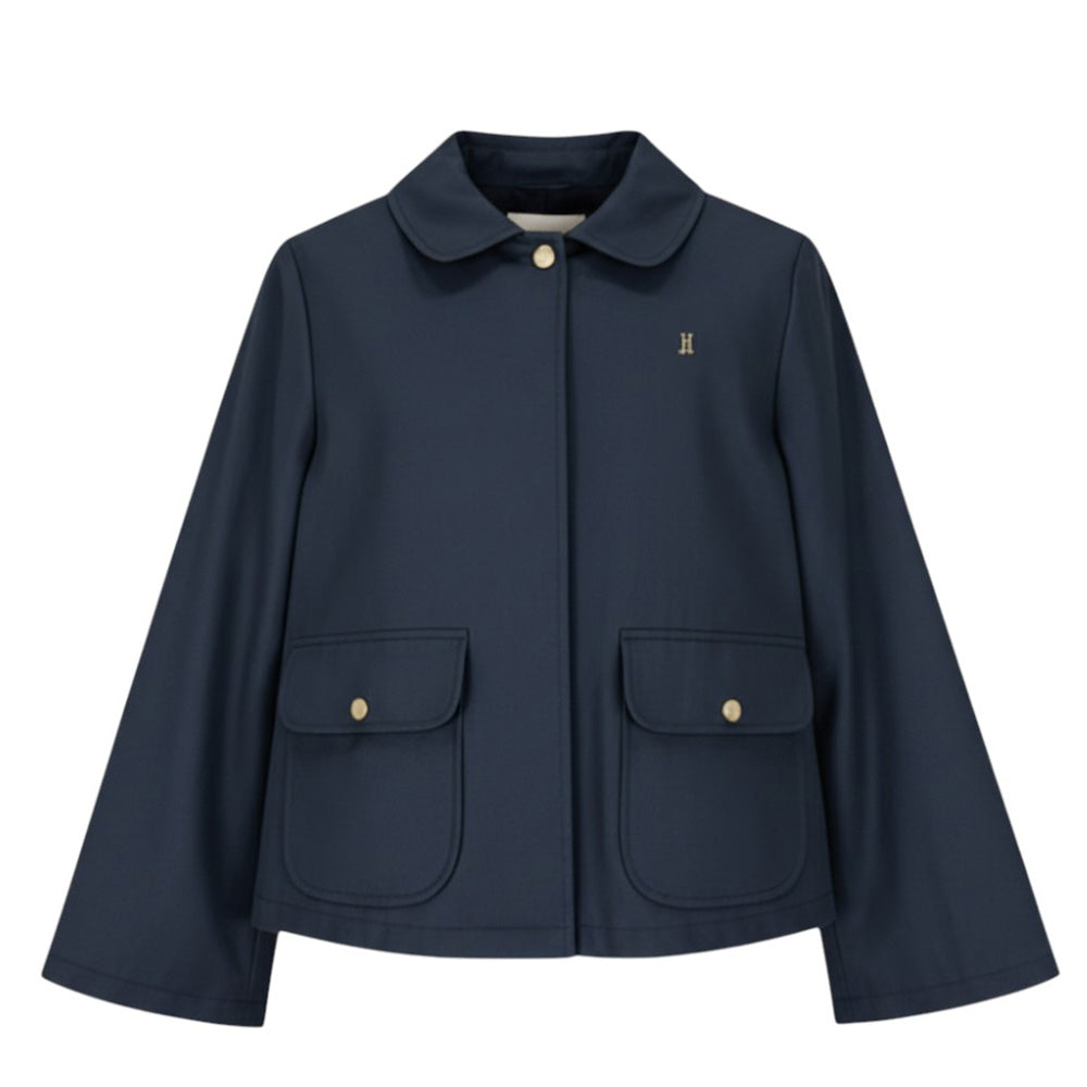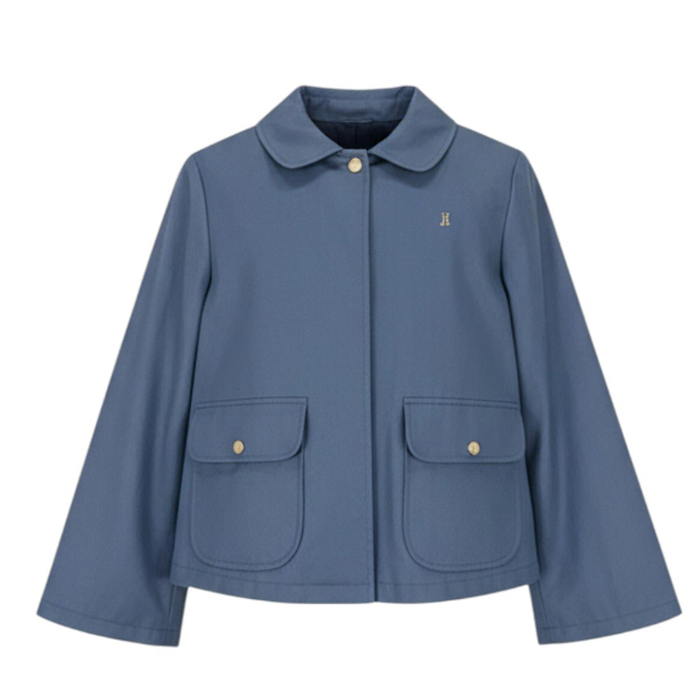 Giacca da bambina realizzata in cotone. Presenta colletto classico, chiusura frontale con bottoni a pressione, maniche lunghe, due tasche con patta applicate sul davanti e orlo dritto.