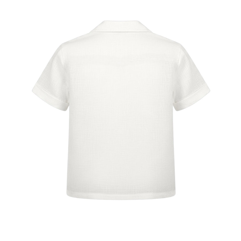 Camicia realizzata in lino, caratterizzata da colletto classico, chiusura frontale con bottoni, maniche corte e orlo dritto.