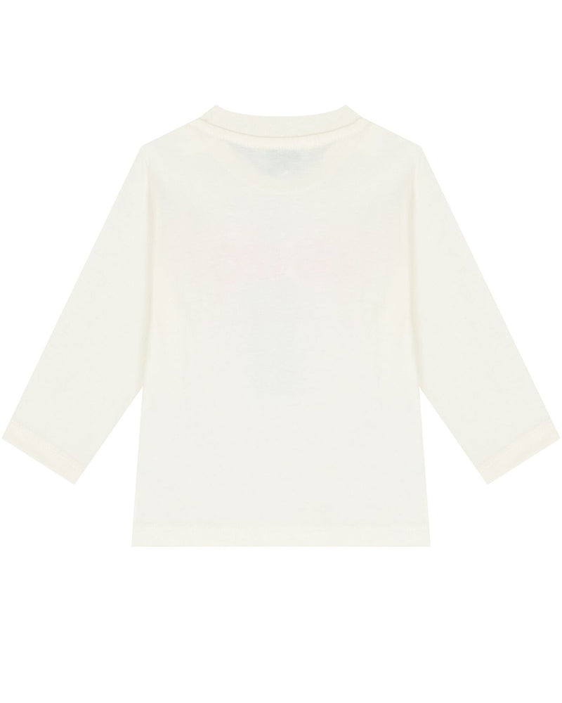 T-shirt avorio da bambina realizzata in jersey di cotone, è caratterizzata da collo tondo, maniche lunghe, stampa logo sul davanti, chiusura con bottoncini a pressione sulla spalla e orlo dritto.