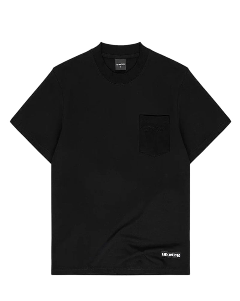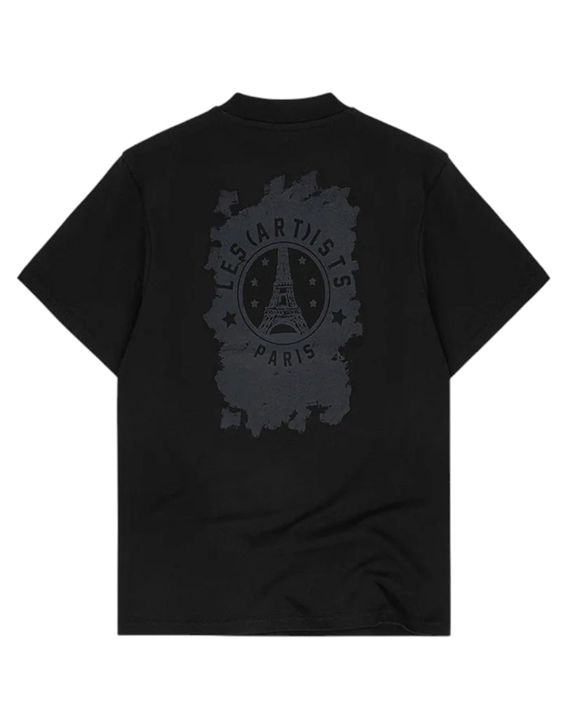 T-shirt girocollo maniche corte nera con tasca sul petto, dettaglio testuale "No More Rules" sulla tasca Logo LES (ART)ISTS Paris con la Torre Eiffel sul retro, effetto fumo.