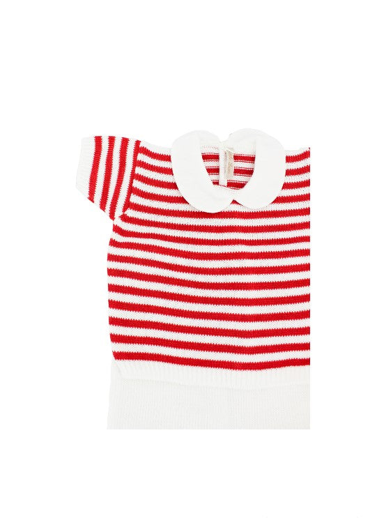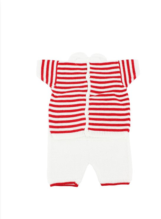 Kleines Bären-Outfit aus rot-weiß gestreiftem Garn.