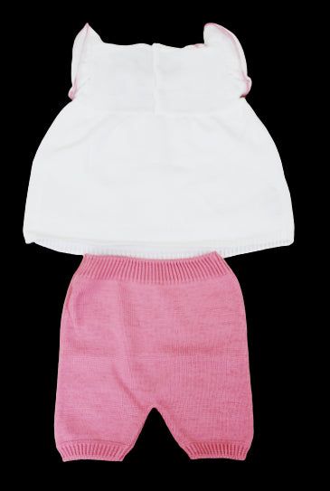 Kleines Bären-Outfit aus weißem und pfirsichrosa Garn.