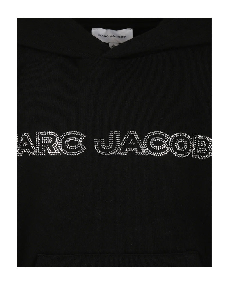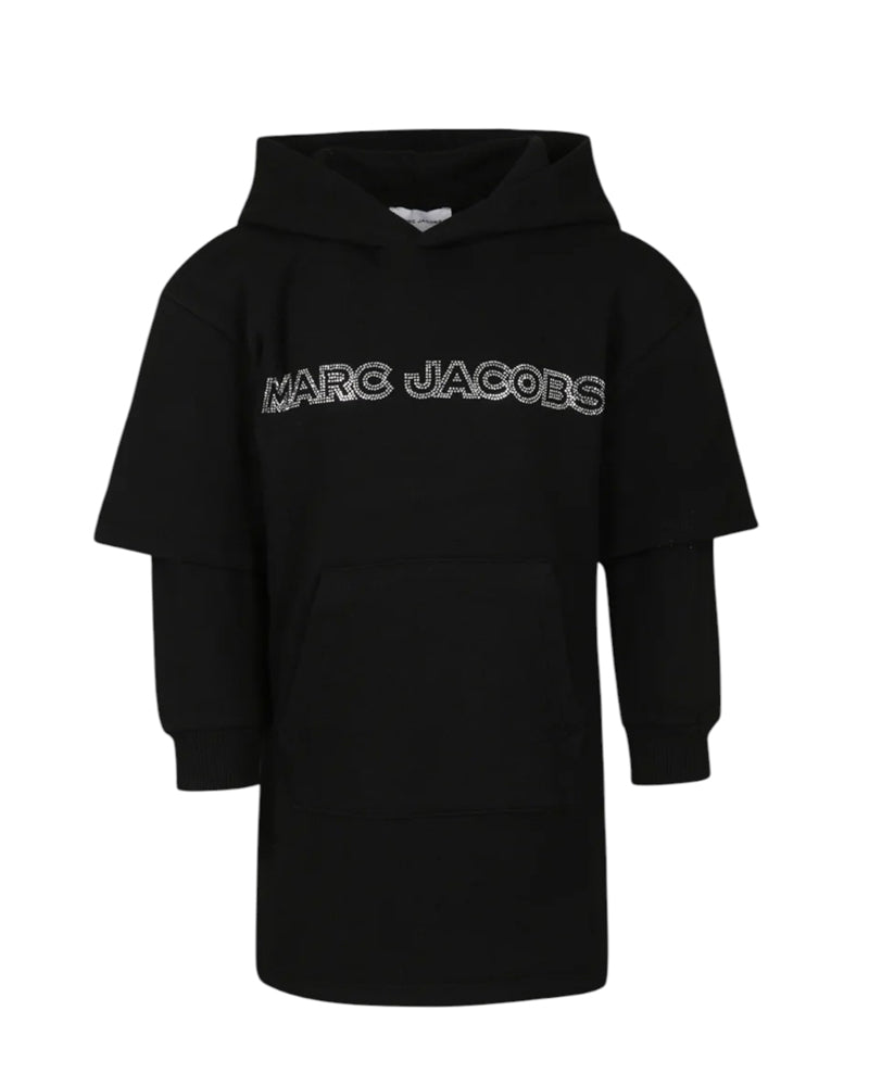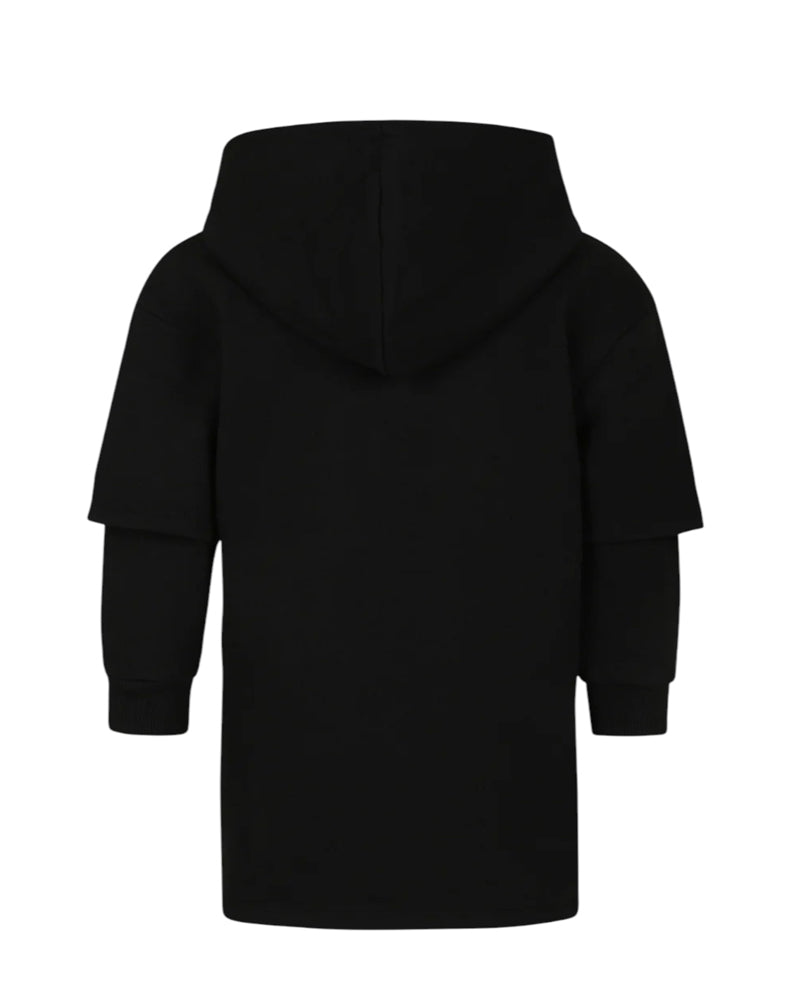 Abito con cappuccio realizzato in felpa di cotone da bambina. Presenta maniche lunghe con polsi a coste, tasca a marsupio sul davanti, orlo dritto. È decorato con applicazione logo in strass sulla parte anteriore.