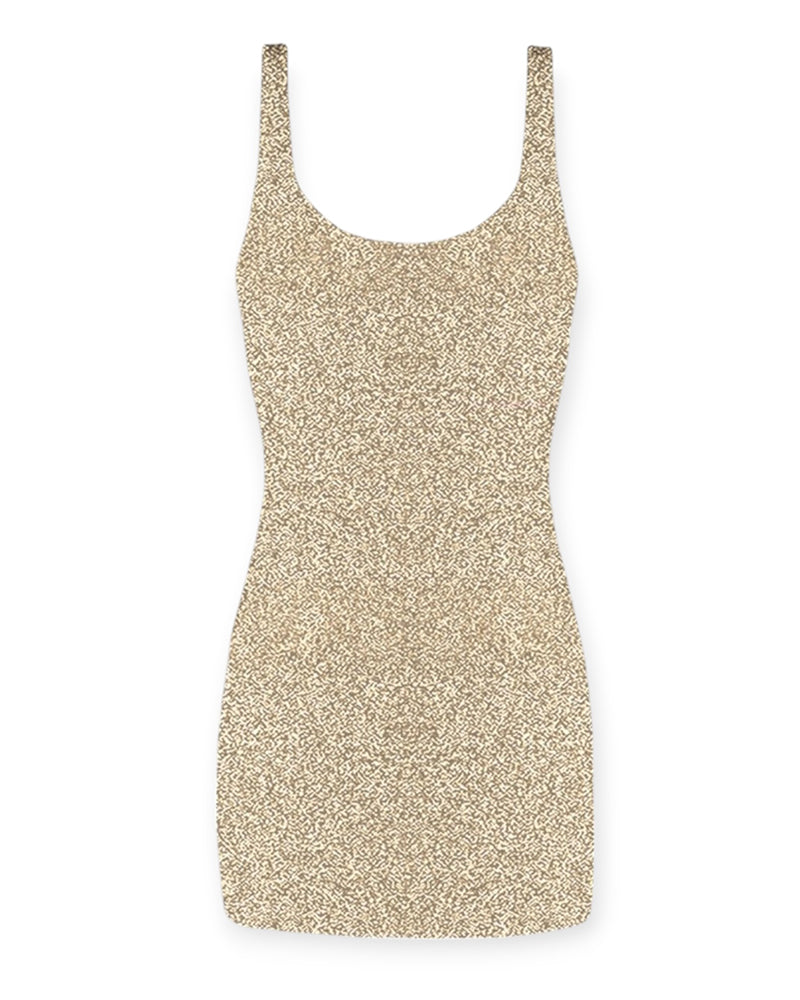 Abito mini in maglina con scollo tondo, spalline larghe, tessuto lurex.