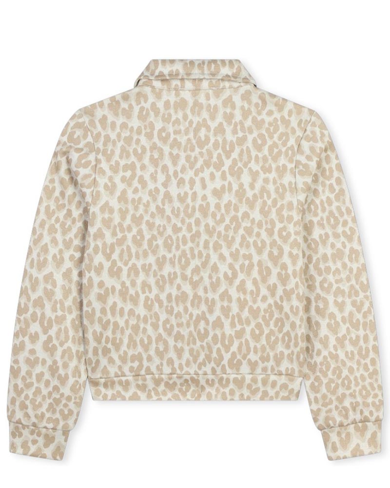 Giacca con motivo leopardato e dettagli glitter all-over. Presenta collo a punta, chiusura frontale con zip, due tasche decorative con patta sul petto, orlo e polsi a coste.