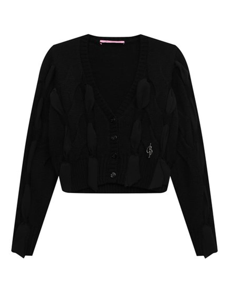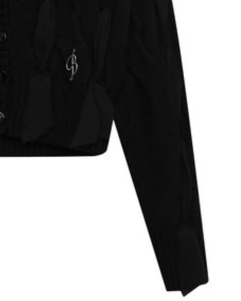 Cardigan cropped realizzato in misto lana. Presenta scollo a V, lavorazione a treccia con dettagli del cinturino intrecciato, maniche lunghe, chiusura frontale con bottoni e finiture a coste. È decorata con targa logata in metallo sulla parte anteriore.