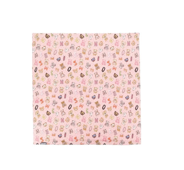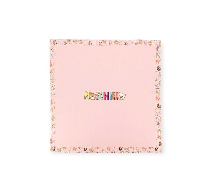 Reversibler Moschino-Einband: Teddy und Allover-Buchstaben auf der einen Seite und einfach nur mit mehrfarbiger Schrift auf der anderen Seite.
