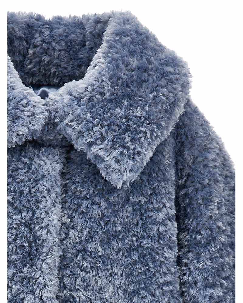 Ecopelliccia realizzata in tessuto teddy da bambina. Presenta colletto a punta, maniche lunghe, chiusura frontale con bottoni automatici e tasche con patta sulla parte anteriore.