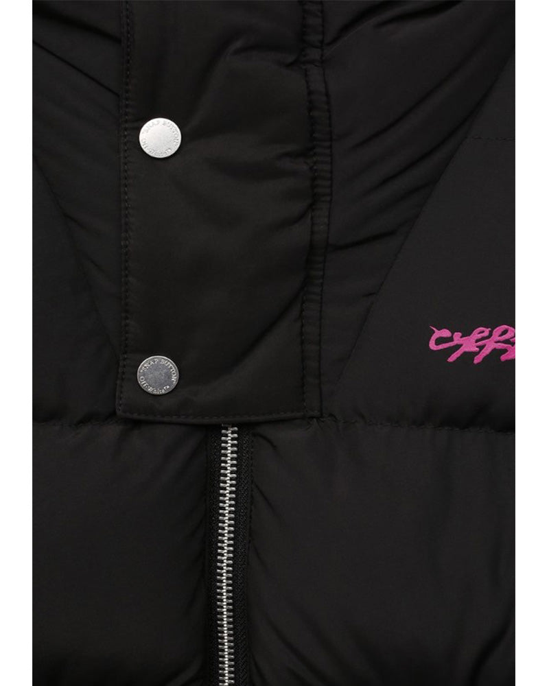 Kurze Jacke, elastischer Saum, feste Kapuze, kontrastierender Druck.
