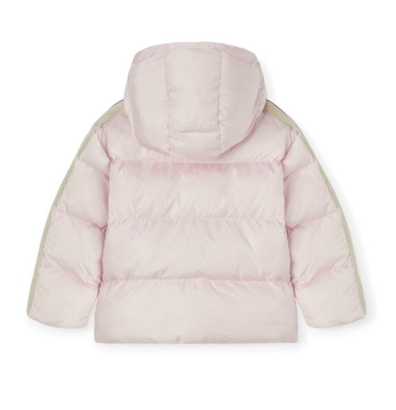 Gesteppte Nylonjacke mit abnehmbarer Kapuze, Reißverschluss vorne, seitlichen Eingrifftaschen, kontrastierenden Streifen an den Ärmeln und Logodruck auf der Brust.