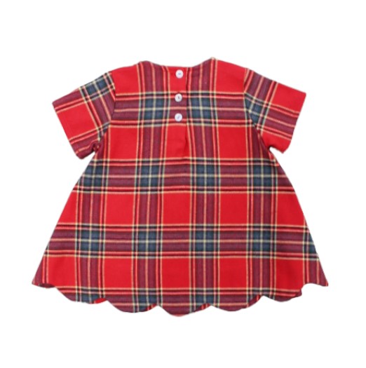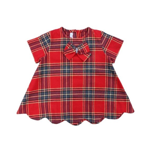 Kurzärmliges Baby-Mädchen-Stoffkleid, Allover-Schottenmuster, runder Kragen, Schleifenapplikation auf der Vorderseite, gewellter Saum, Knopfverschluss auf der Rückseite.