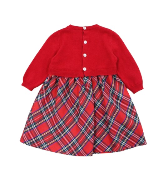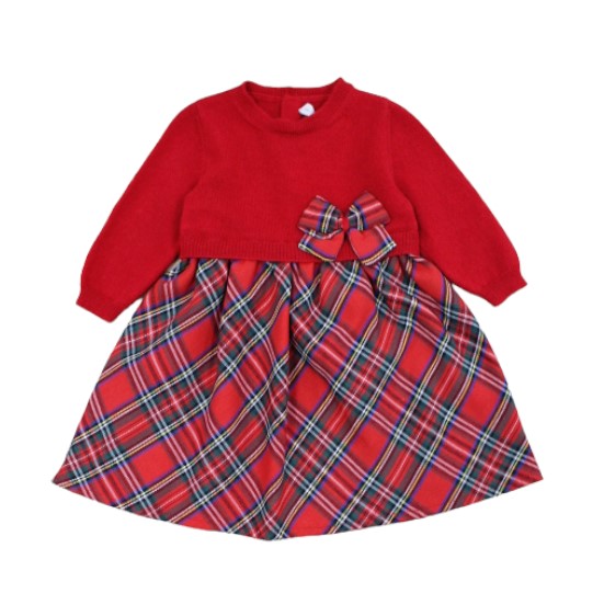 Langärmliges Mädchenkleid aus Bi-Stoff, Oberteil aus Wolle mit aufgesetzter Schleife auf der Vorderseite, Rock aus Baumwolle mit Schottenmuster und Knopfverschluss auf der Rückseite.