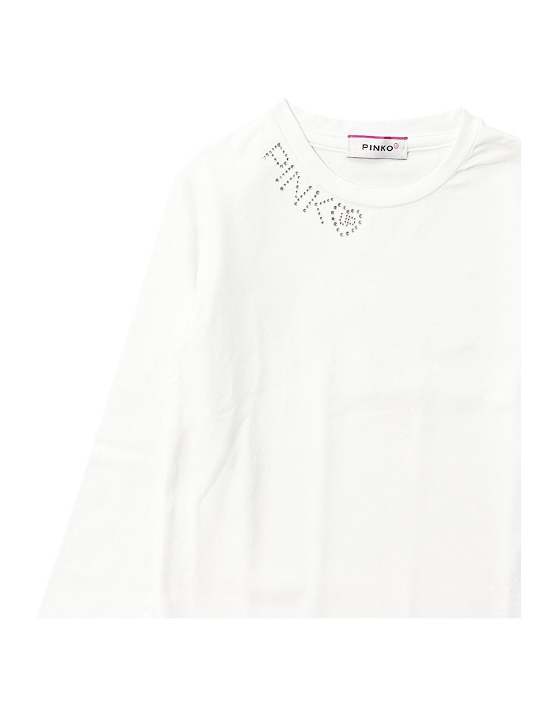 T-shirt bianca da bambina, realizzata in jersey di cotone, caratterizzata da colletto tondo, maniche lunghe e orlo dritto. È decorata con logo in strass applicato sul davanti.