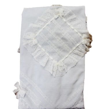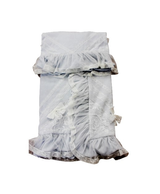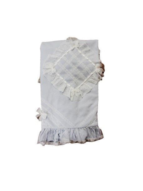 Machen Sie Ihr Baby noch eleganter mit dieser hellblauen Chenille-Decke von Aletta. Das Modell verfügt über ein wunderschönes Spitzen-Rautenmuster in der Mitte und einen entzückenden Rüschenrand. Perfekt, um Ihr Kleines warm zu halten und ihm gleichzeitig einen Hauch von Stil zu verleihen.