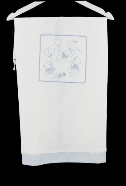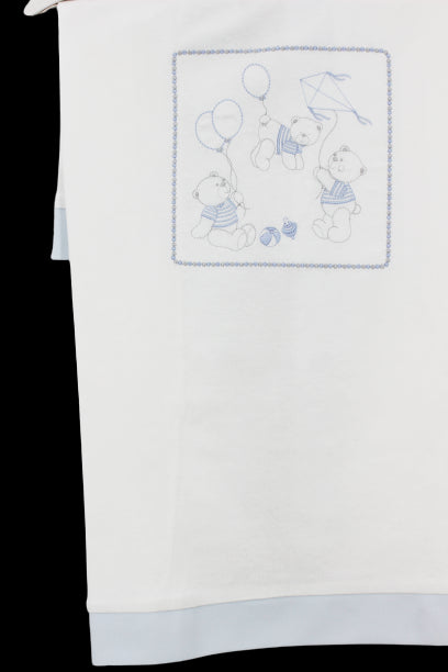 Aletta-Neugeborenendecke aus weißer Baumwolle mit Himmelsrand und zentraler Stickerei.