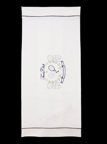 Aletta-Neugeborenendecke aus weißer Baumwolle mit blauen und grauen Details in der Mitte. Modell mit blauem Rand.