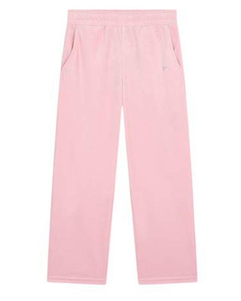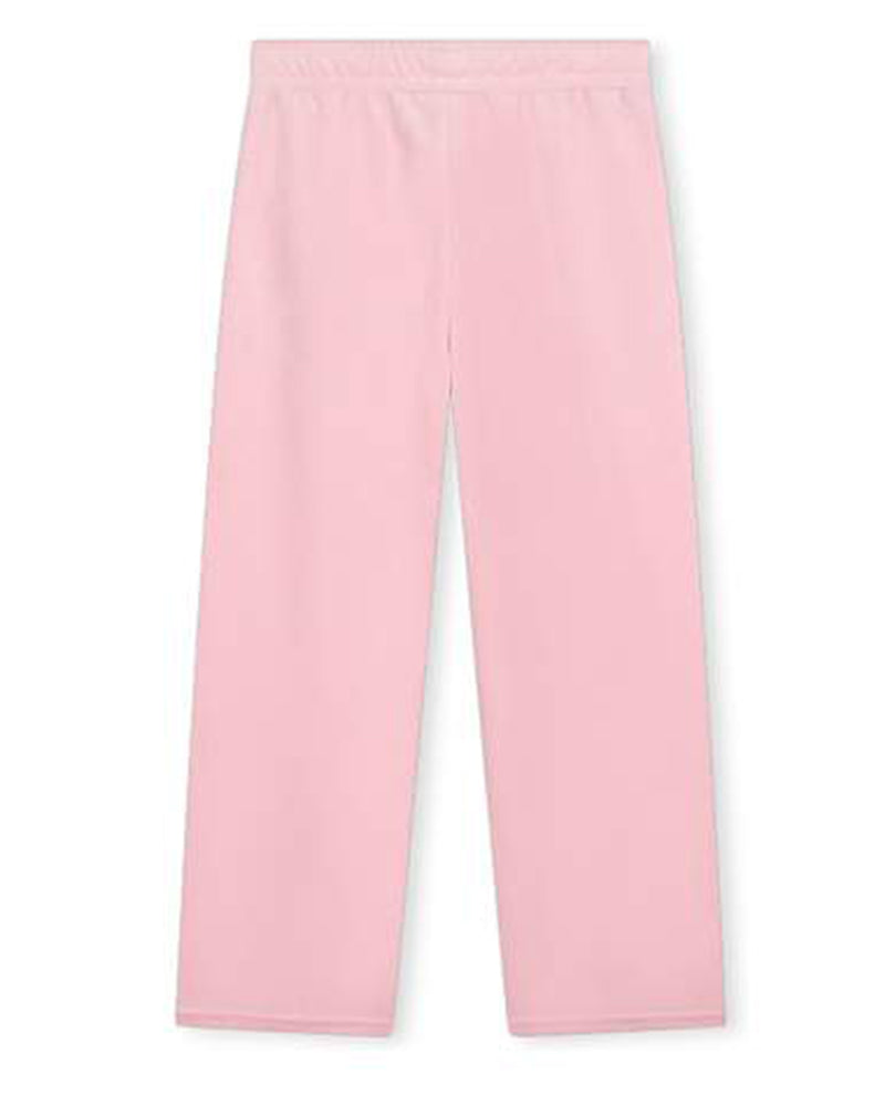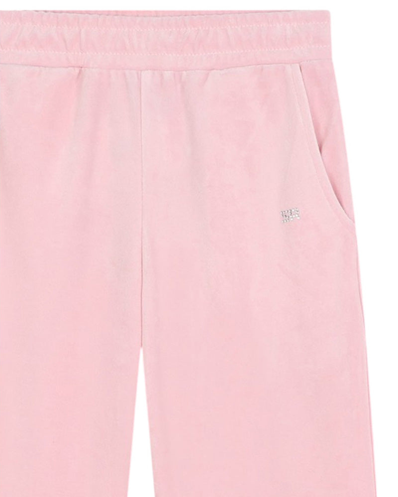 Pantaloni jogger da bambina realizzati in ciniglia. Presentano vita elasticizzata, tasche laterali all'americana, gamba dritta e logo applicato con strass sul davanti.