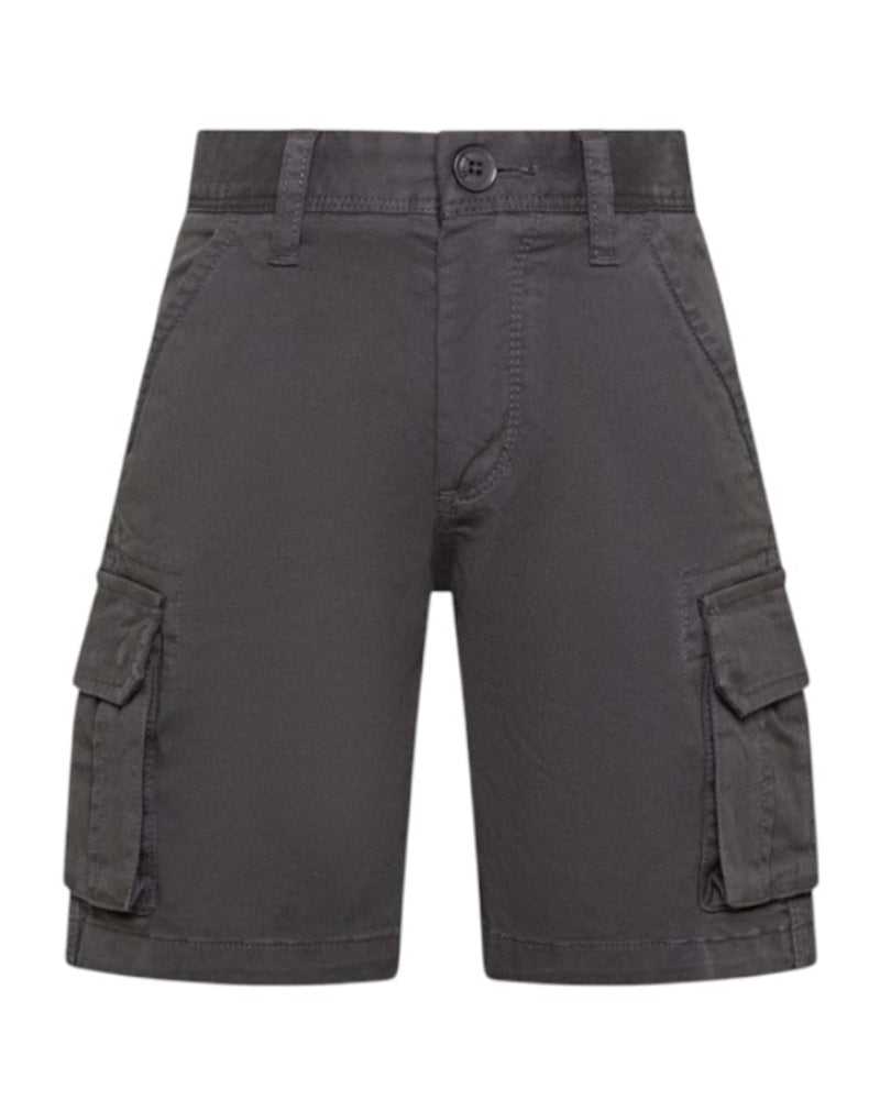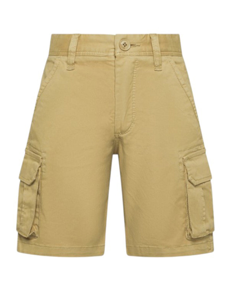 Bermuda cargo realizzato in cotone da bambino. Presenta chiusura frontale con bottone e zip, vita regolabile grazie ad elastico interno con bottoni, tasche laterali america, tasche cargo sui lati e tasche a filo sul retro. È decorato con logo ricamato sul lato.
