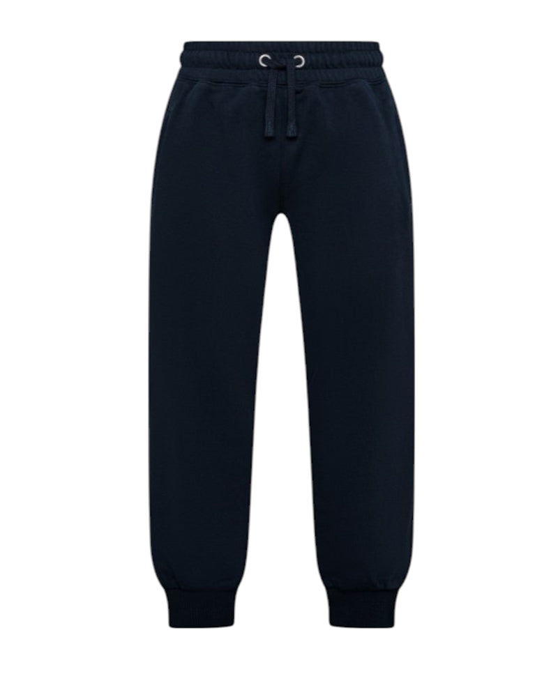 Pantaloni jogger blu da bambino, realizzati in felpa di cotone garzato. Presentano vita elasticizzata con coulisse, due tasche laterali all'americana, una tasca applicata sul retro, fodera in pile, fondo con elastico alla caviglia e zip. Sono decorati con logo ricamato sul retro.