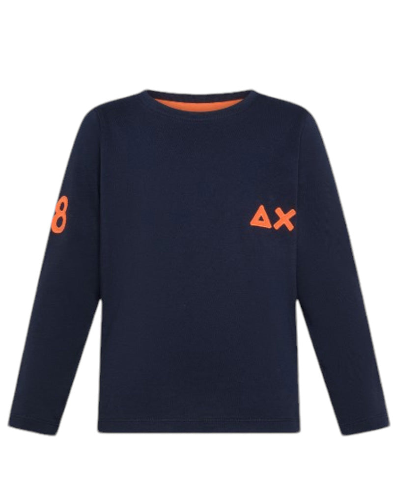 Baumwoll-T-Shirt, normale Passform, Rundhalsausschnitt, lange Ärmel, fluoreszierender „68“-Aufnäher auf dem Ärmel, fluoreszierender SUN68-Logoaufnäher auf der Brust.