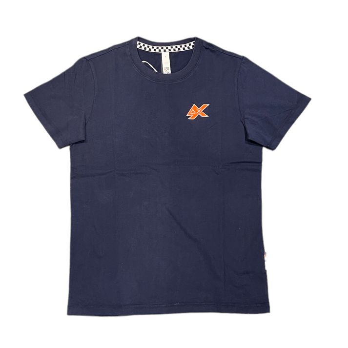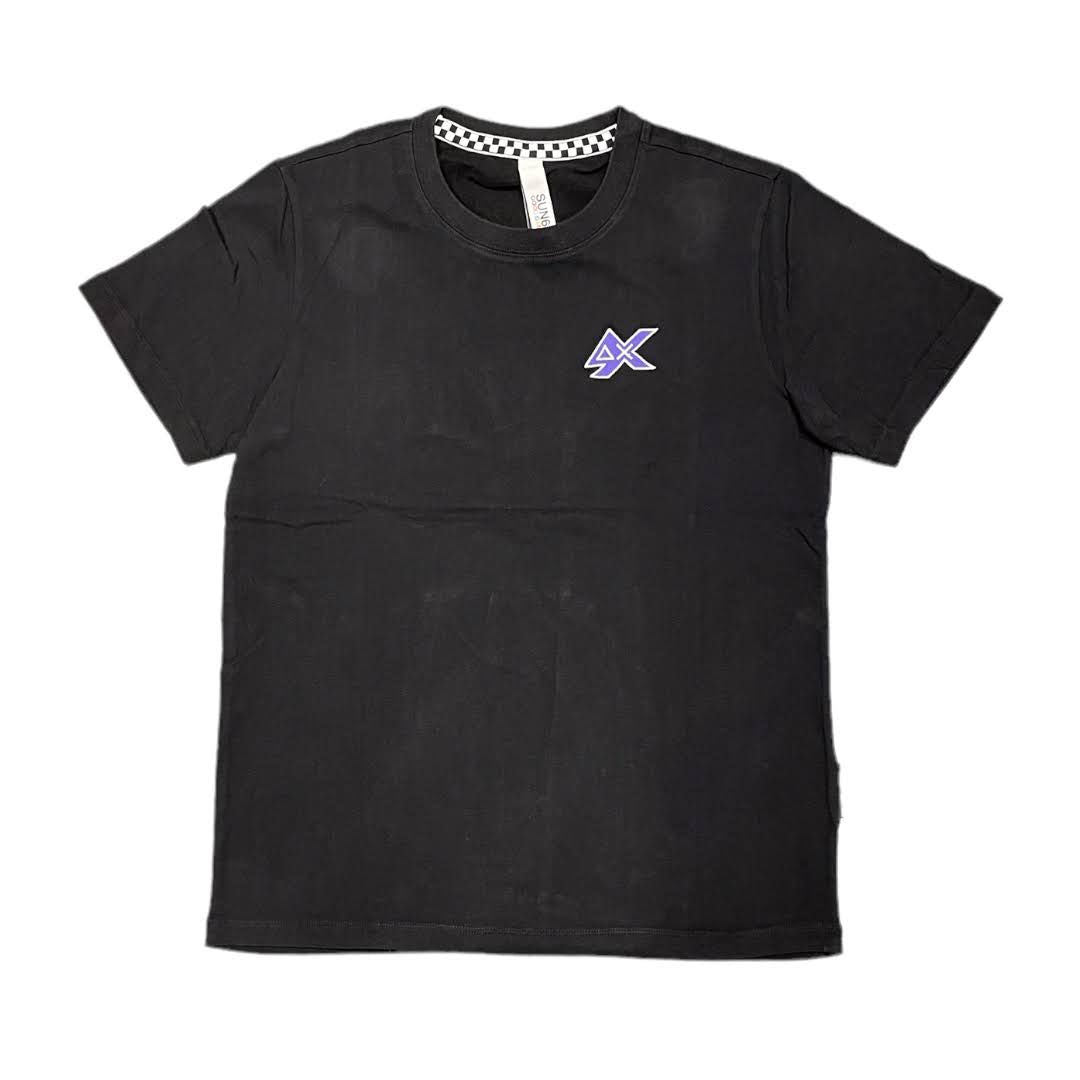 Kurzärmliges T-Shirt mit Rundhalsausschnitt und kontrastierendem gesticktem Logo auf der Vorderseite.