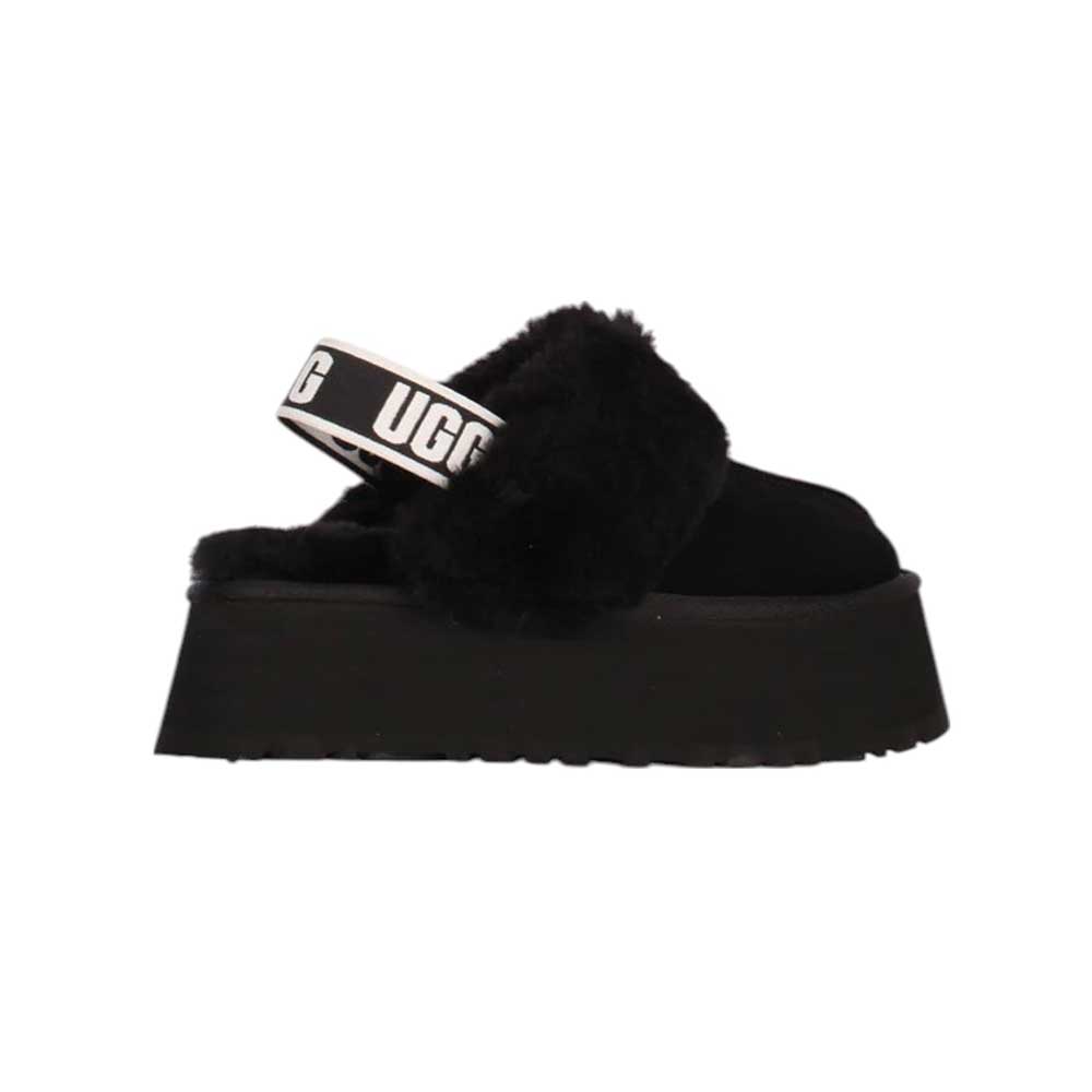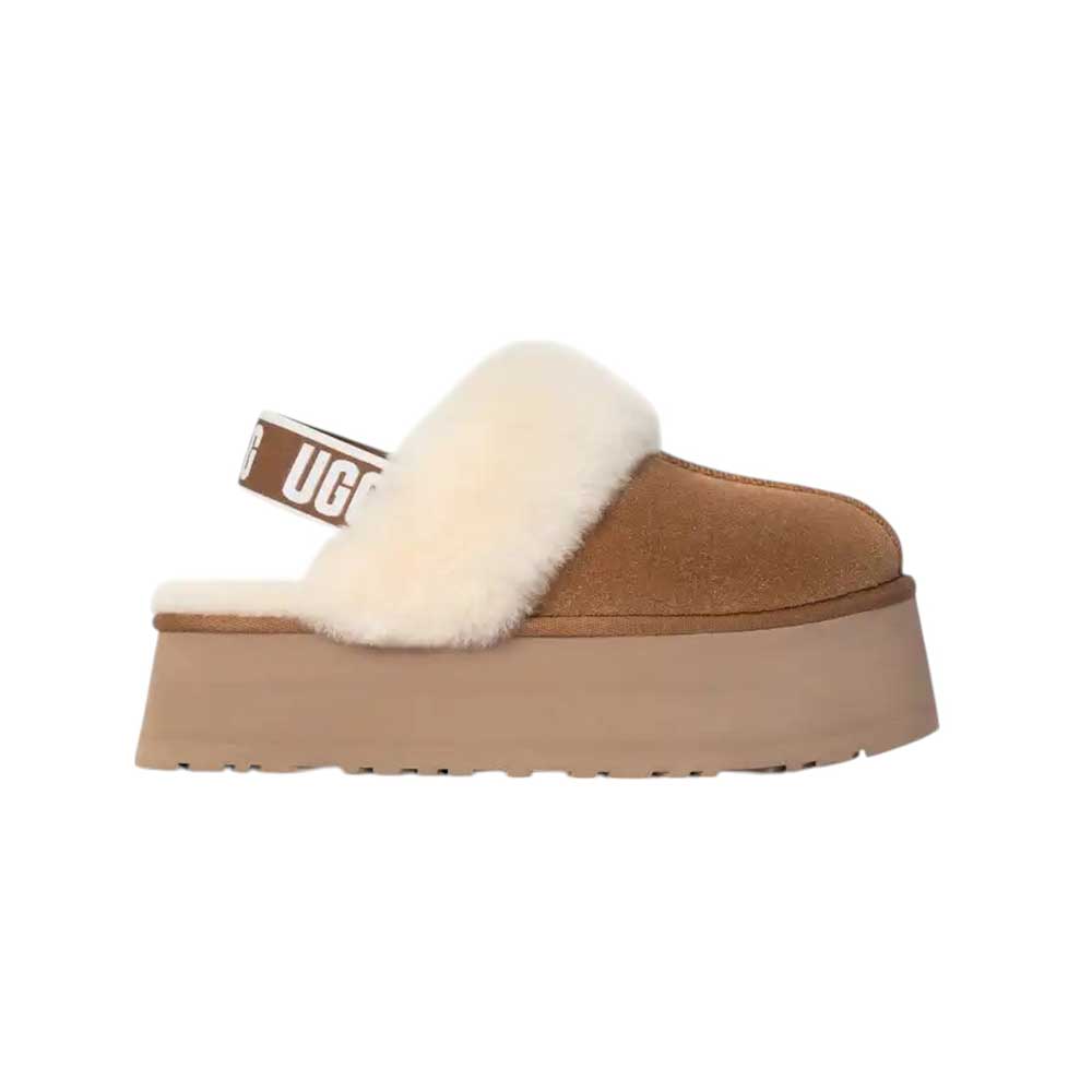 Le ciabatte Ugg Mules Platform 1113474 Funkette combinano sostenibilità e comfort avanzato. Realizzate con un innovativo composto a base di schiuma di canna da zucchero, riducono l’uso di combustibili fossili sostituendo l’etilene tradizionale. La tomaia in camoscio e il collarino in montone garantiscono morbidezza e calore, mentre il cinturino elastico con grafica UGG® assicura una calzata stabile. La fodera e la soletta in montone da 10 mm offrono un’ammortizzazione naturale, completate dalla suola in EVA leggera e resistente. Il tacco di 5,08 cm aggiunge un tocco di eleganza senza rinunciare al comfort.