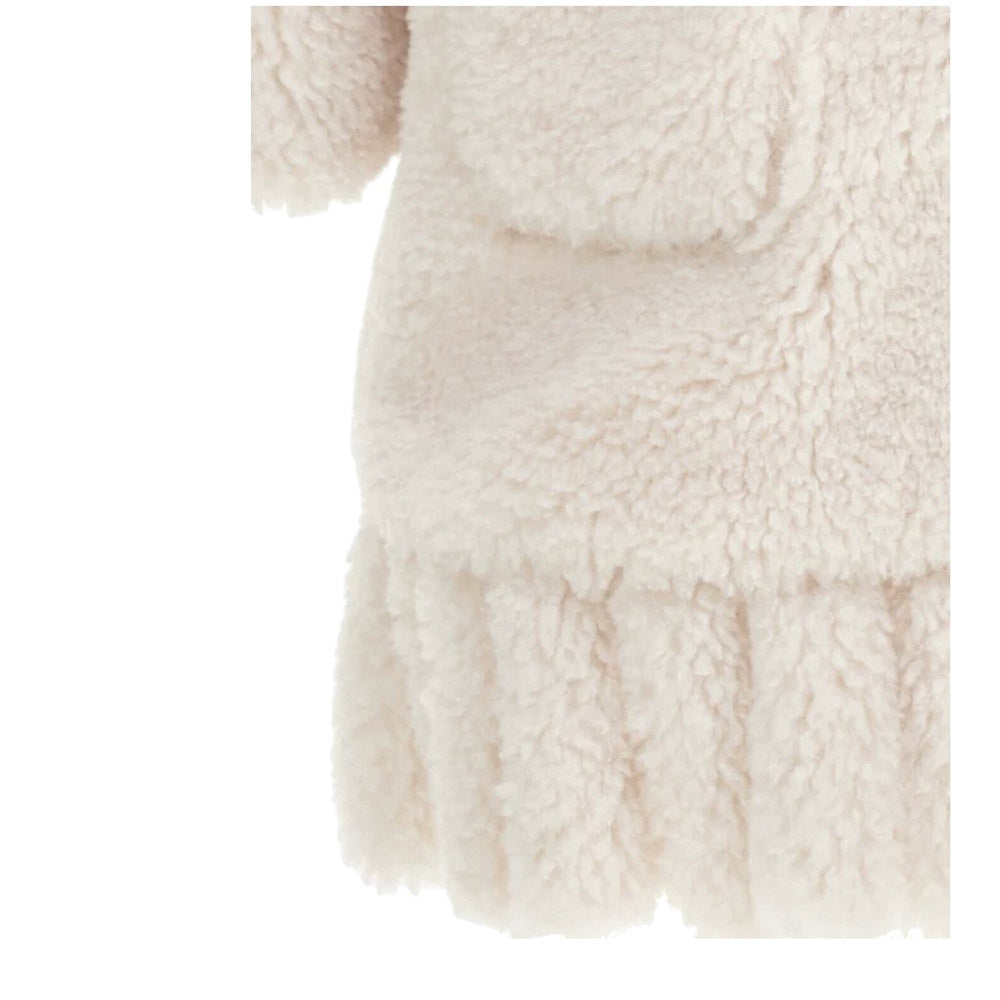 Cappotto Teddy caratterizzato da collo a revers, chiusura frontale con bottoni a pressione, maniche lunghe, due tasche applicate sul davanti e orlo a balze.