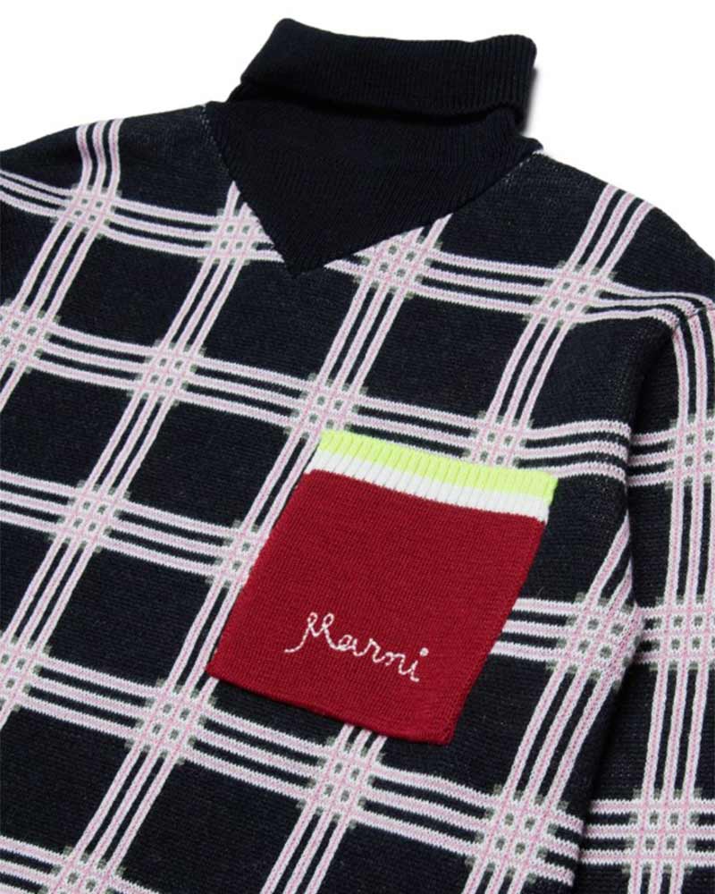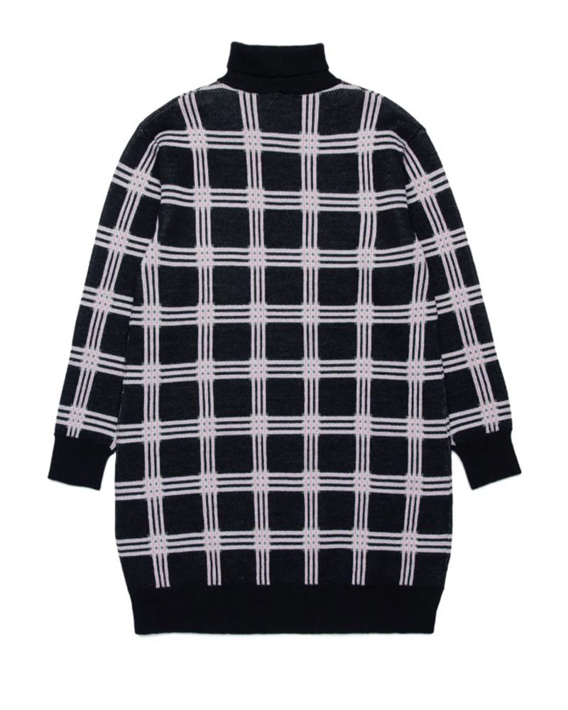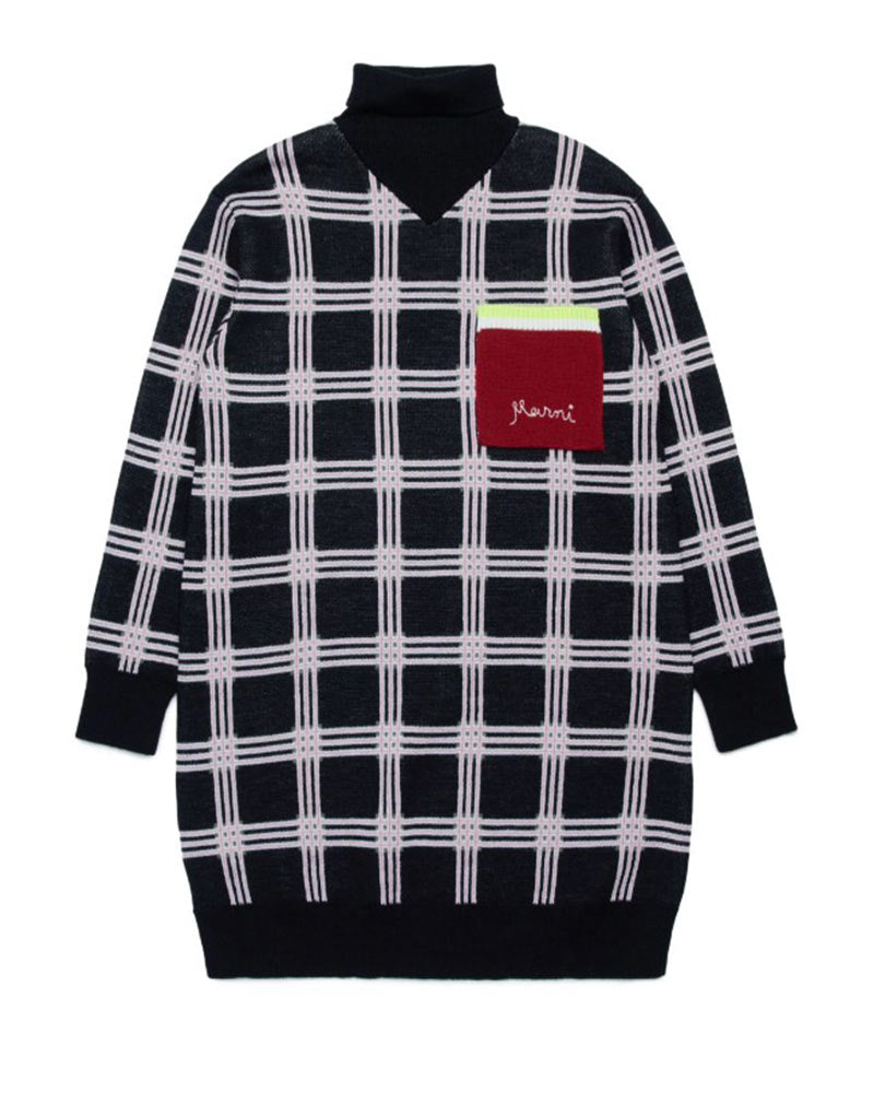 Abito realizzato in misto lana da bambina. Presenta collo alto, maniche lunghe, fantasia a quadri all-over e finiture a coste. È decorato con taschino applicato sul petto con logo ricamato.