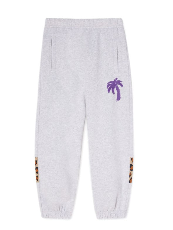 Pantalone in felpa di cotone con elastico in vita ed alla caviglia, tasche laterali a filo, stampa sul davanti ed inserti in fantasia posteriori.