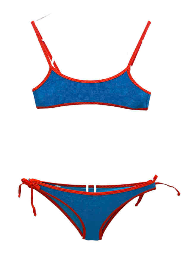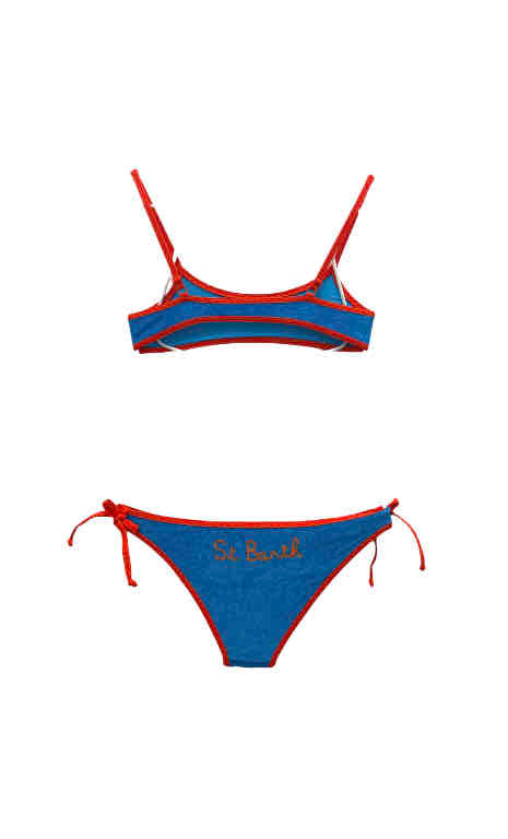 Costume da bambina due pezzi in spugna. Top a fascia con spalline regolabili e schiena chiusa, slip con i lacci decorativi e logo ricamato sul retro.