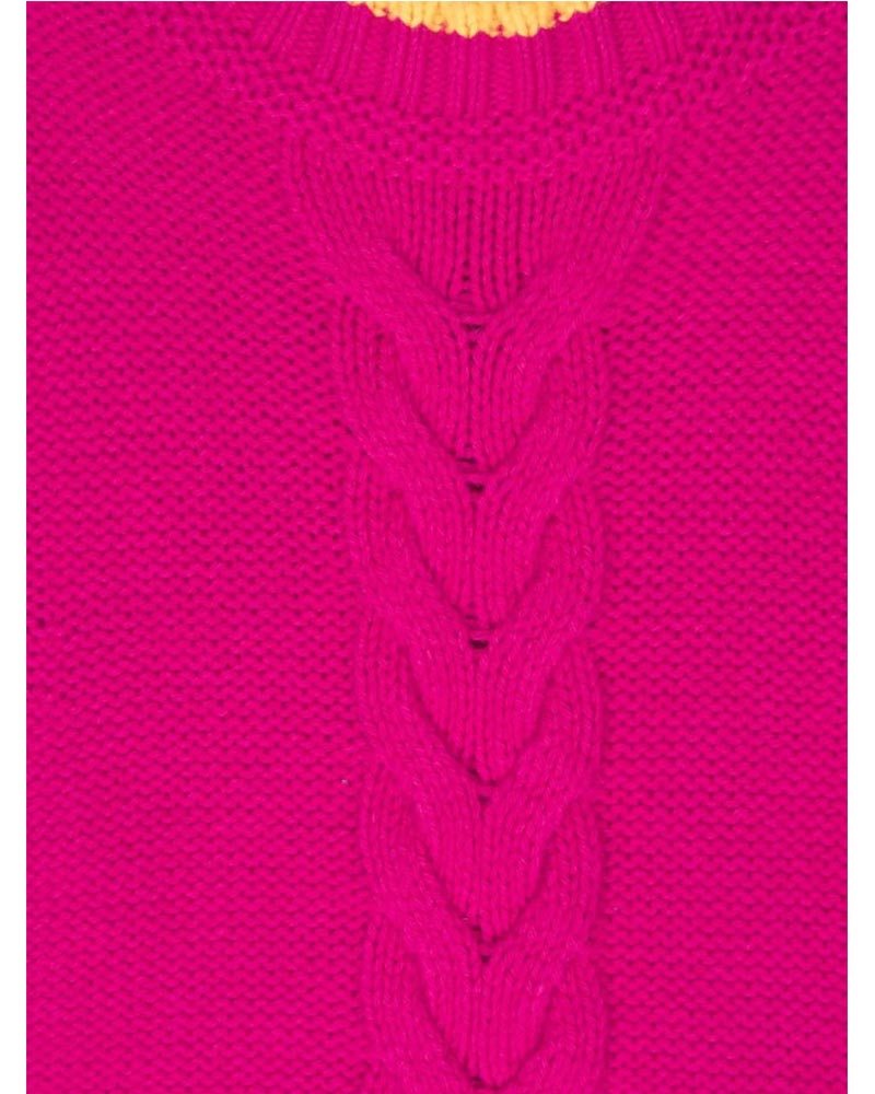 Gilet da bambina realizzato in lana con lavorazione a treccia sul davanti, finiture a costine e orlo dritto.