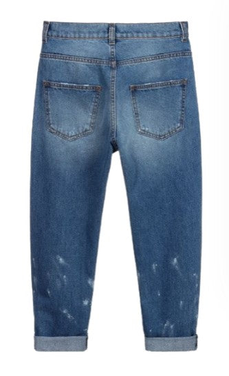 Jeans modello cinque tasche. Chiusura frontale con bottone e zip. Logo stampato lateralmente.