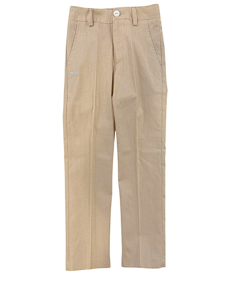 Pantaloni eleganti da bambino in misto lino, chiusura frontale con bottone e zip, tasche laterali america, patch logo tone on tone applicata sul davanti, taschino posteriore a filo.
