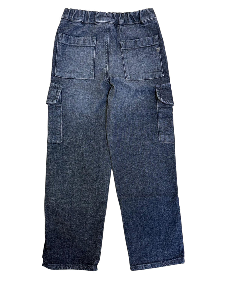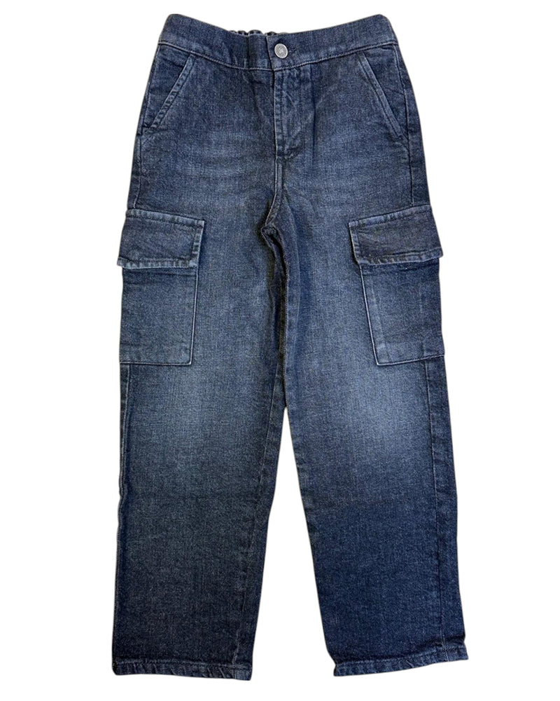 Jeans cargo realizzati in denim di cotone stretch da bambino. Presentano chiusura frontale con zip e bottone, vita elasticizzata sul retro, tasche laterali all'americana e tasche cargo ai lati. Sono decorati con logo in metallo sulla parte posteriore.