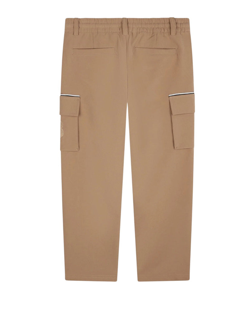 Pantaloni realizzati in misto nylon da bambino. Presentano vita elasticizzata sul retro, chiusura frontale con zip e bottoni, passanti per la cintura, tasche laterali america, tasche cargo con logo ricamato sui lati e tasche a filo sul retro.