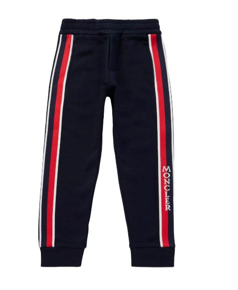 Pantalone in felpa di cotone con elastico in vita ed alla caviglia, tasche laterali a filo, bande laterali con logo intarsiato in contrasto.
