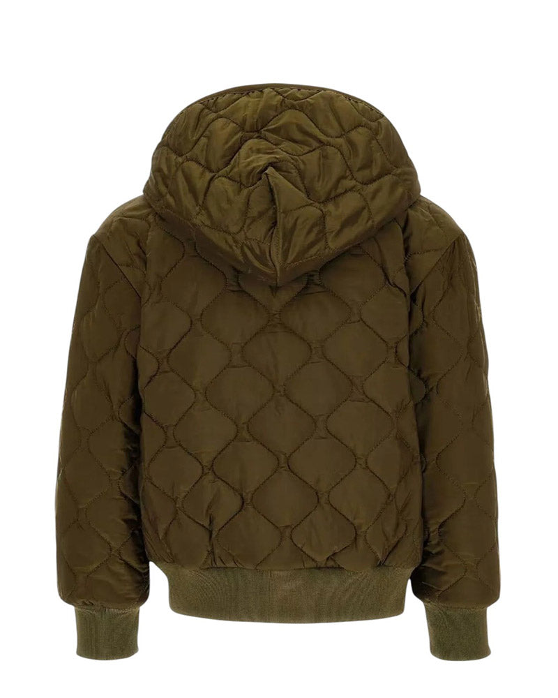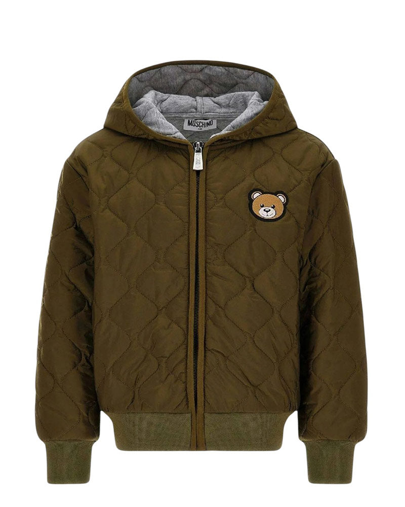 Giubbino verde da bambino, leggermente imbottito, realizzato in poliammide. Presenta design trapuntato, cappuccio fisso, chiusura frontale con zip, maniche lunghe con polsi a coste, fodera in jersey, due tasche laterali a filetto e orlo a coste. È decorato con patch Teddy Bear applicata sul petto.
