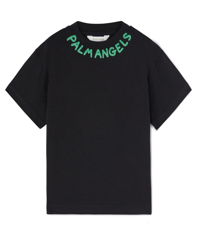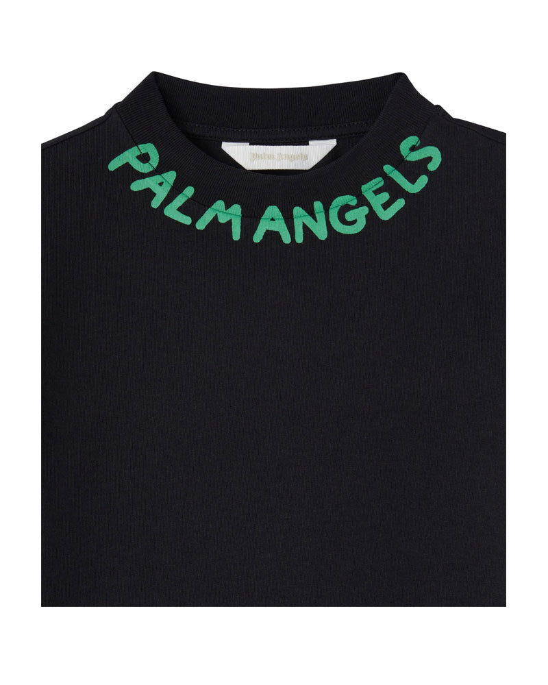 T-shirt girocollo a maniche corte in cotone di Palm Angels junior con stampa logo in verde intorno al collo con effetto fatto a mano.