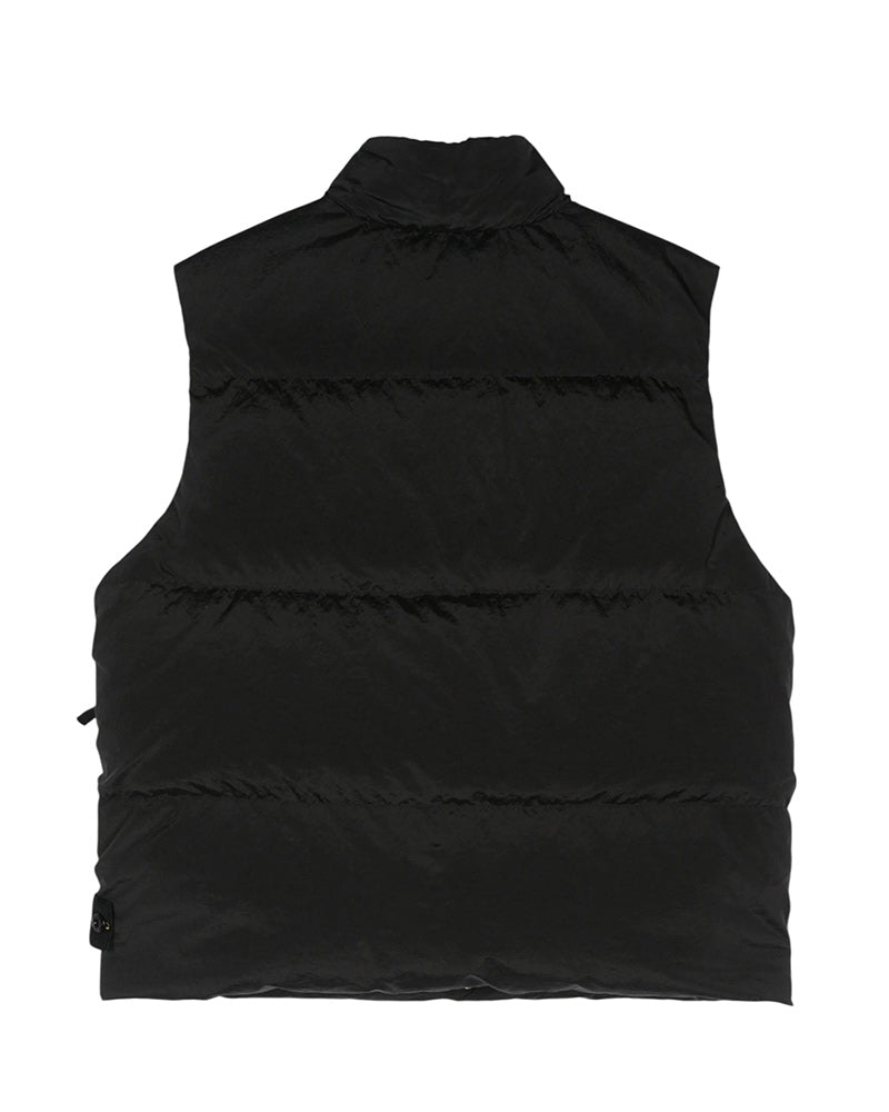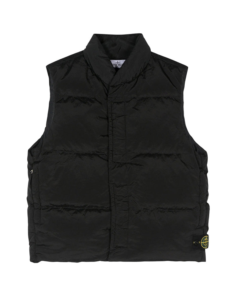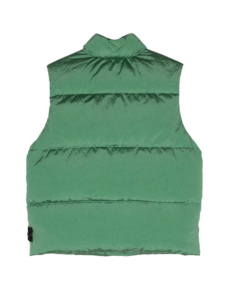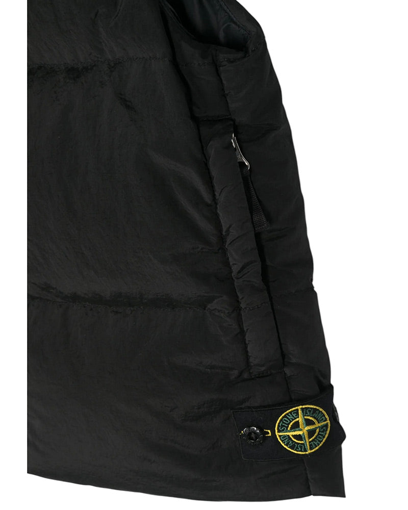 Smanicato imbottito, realizzato in nylon. Presenta design trapuntato, chiusura frontale con zip e velcro, due tasche laterali a filetto con zip e orlo dritto. È decorato con applicazione laterale di Badge Stone Island.