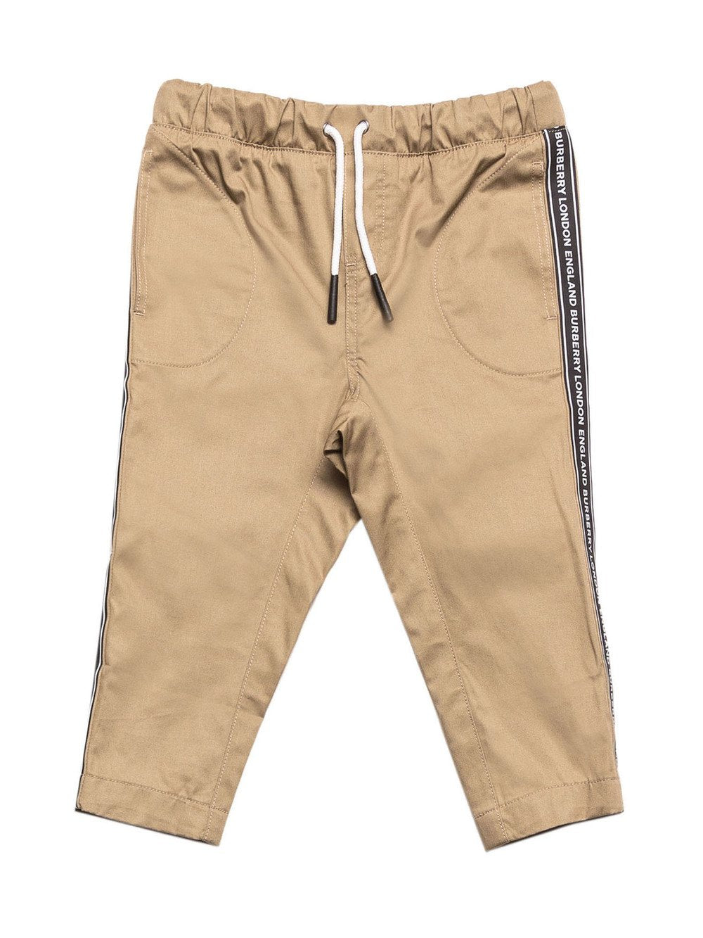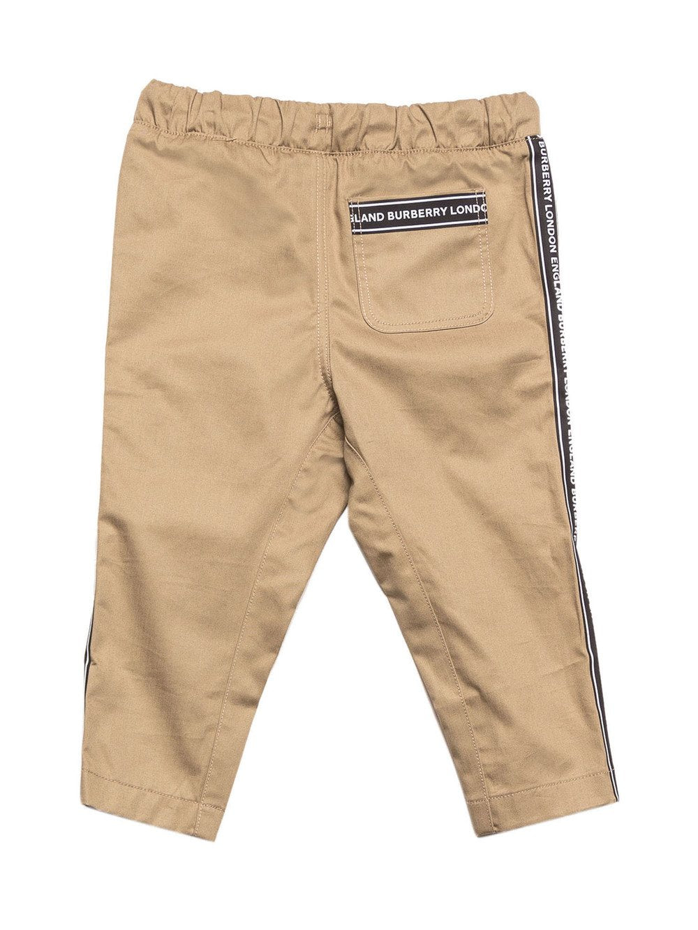 Pantalone in cotone, tasca a filetto, vita elasticizzata, bande laterali logate.