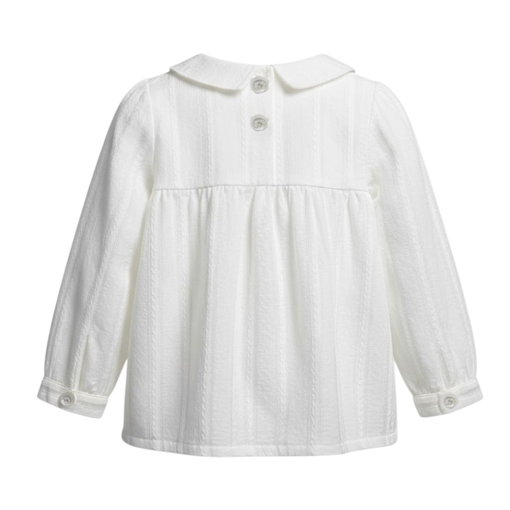 Camicia realizzata in cotone, caratterizzata da colletto con volant, maniche lunghe, chiusura con bottoncini sul retro e orlo svasato.