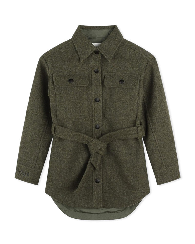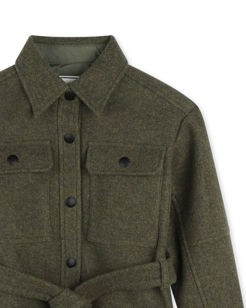 Camicia verde da bambina realizzata in morbido panno. Presenta colletto a punta, chiusura frontale con bottoni a pressione, maniche lunghe e orlo curvo. È decora con due tasche con patta applicate sul petto e cinturino in vita.