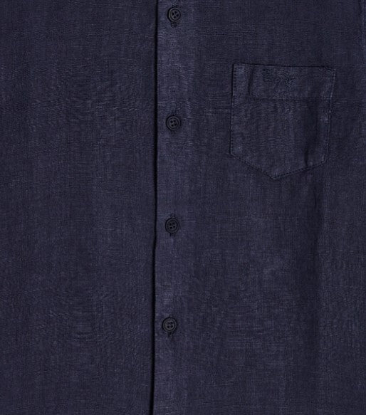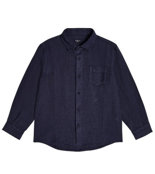 Camicia bimbo in lino a maniche lunghe con colletto classico, logo ricamato sul taschino frontale. Chiusura anteriore con bottoni.