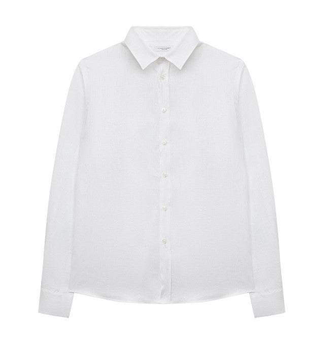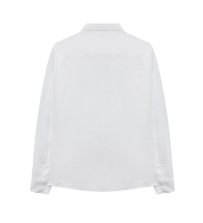 Camicia bambino con colletto a punta realizzata in lino, chiusura anteriore con bottoni.