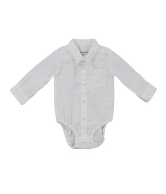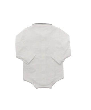 Camicia body neonato a maniche lunghe. Apertura frontale con bottoni, chiusura sul fondo con bottoncini automatici. Papillon removibile.