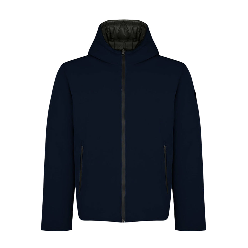 Giubbino realizzato in tessuto tecnico Bio Finish Stretch , caratterizzato da vestibilità slim, cappuccio fisso, chiusura frontale con zip, maniche lunghe con polsi a coste, due tasche laterali a filetto con zip e orlo con coulisse regolabile. È decorato con patch logo applicata sulla manica.
