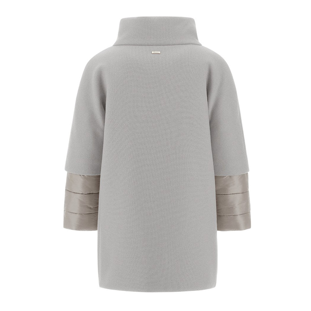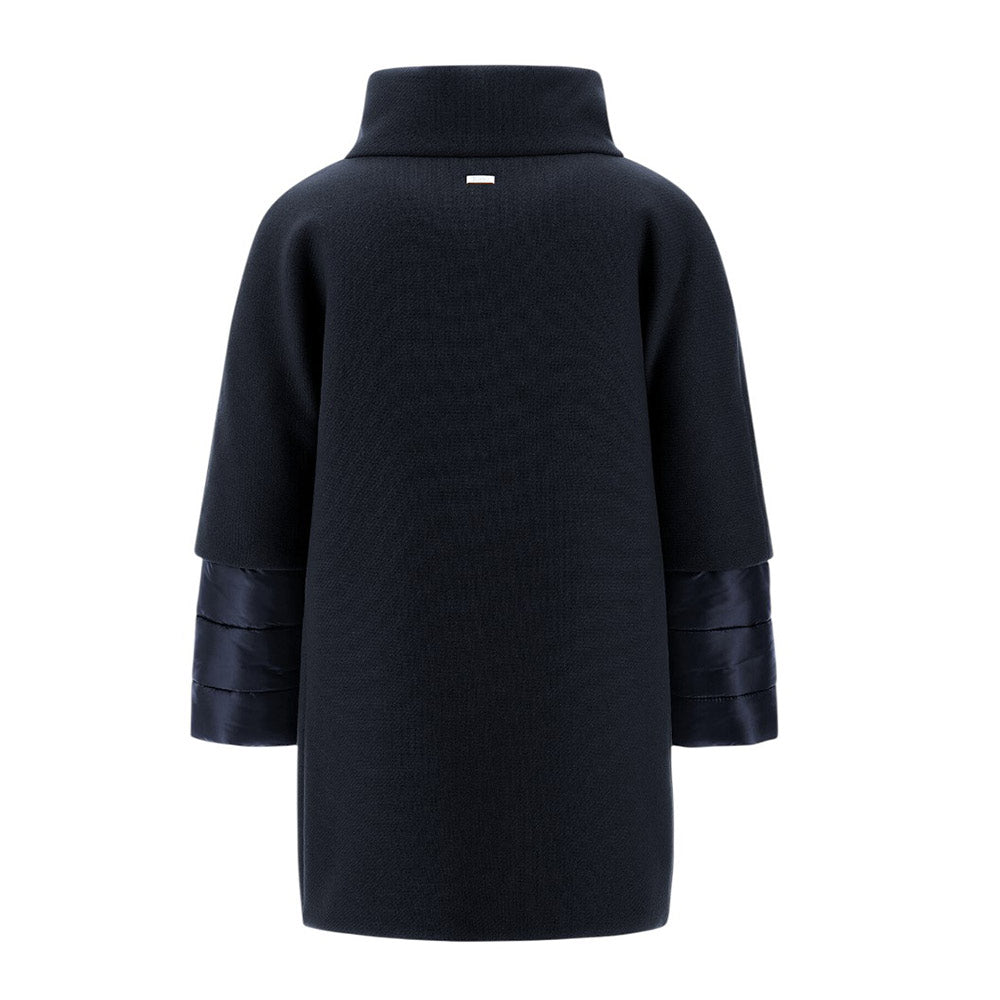 Cappotto imbottito realizzato in twill di lana vergine pettinata. Presenta collo alto, maniche lunghe con polsi in nylon, due tasche laterali a filetto e orlo dritto. È decorato con placca logo applicata sul retro.