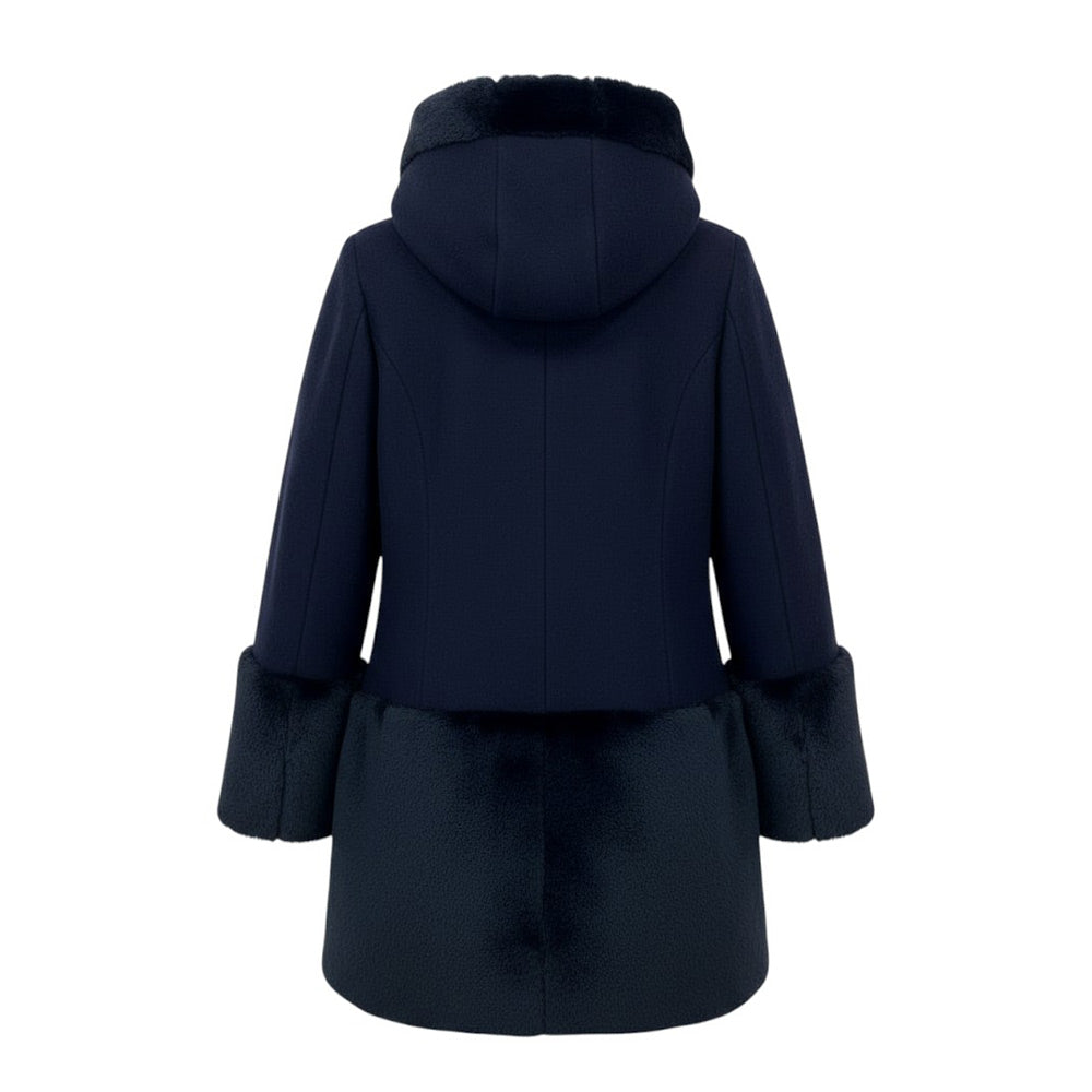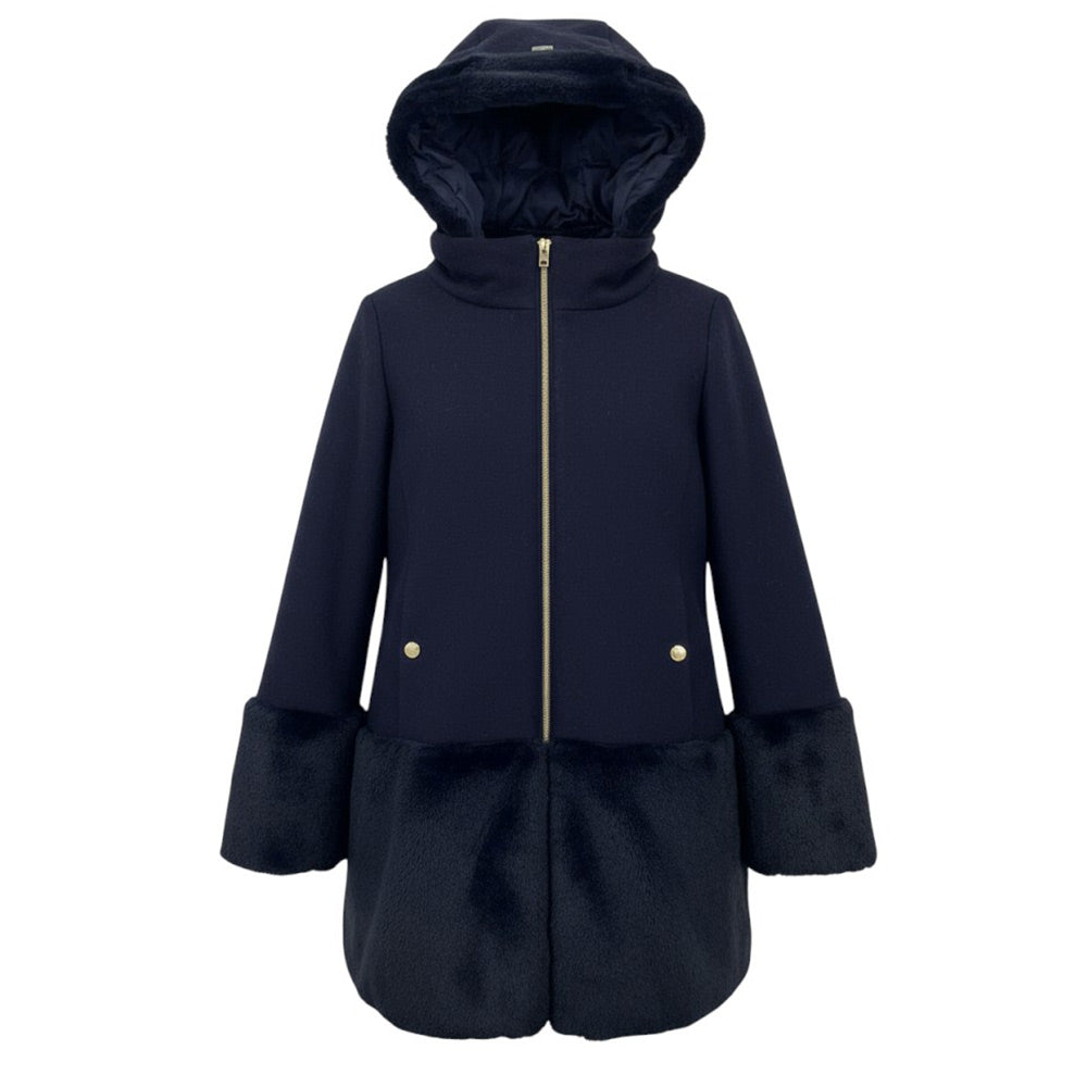 Cappotto imbottito realizzato in twill di lana vergine pettinata. Presenta collo alto, cappuccio in nylon rimovibile, chiusura frontale con zip, maniche lunghe, due tasche laterali a filetto, polsi e orlo rifiniti in pelliccia sintetica. È decorato con placca logo applicata sul cappuccio.