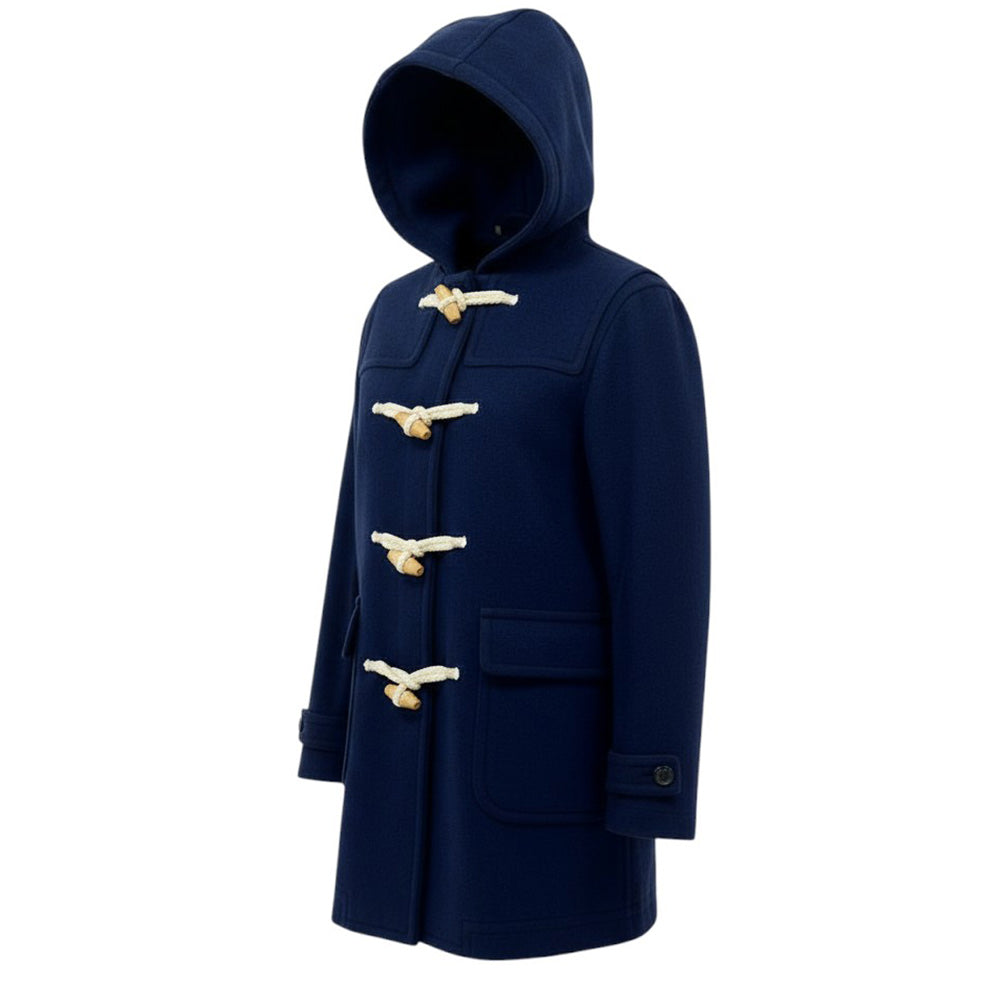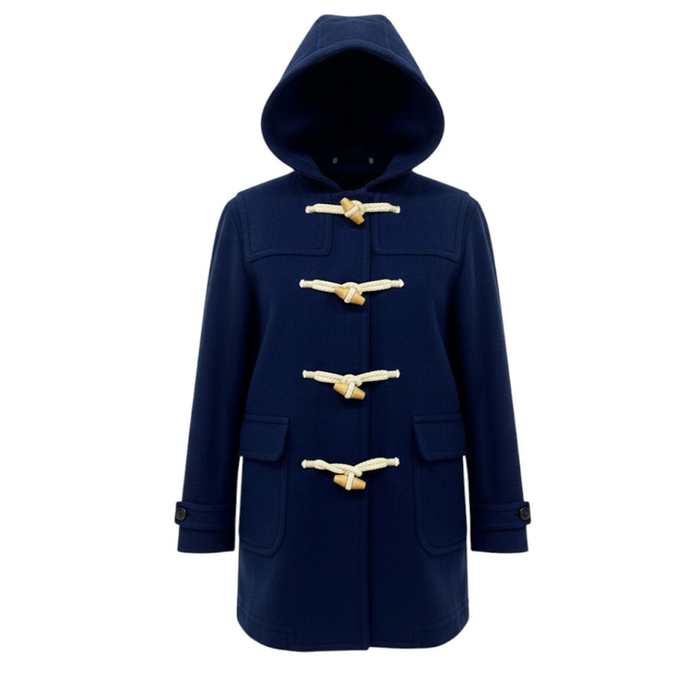 Montgomery realizzato in panno di misto lana. Presenta cappuccio, chiusura frontale con zip e alamari, maniche lunghe, due tasche con patta applicate sul davanti e orlo dritto.